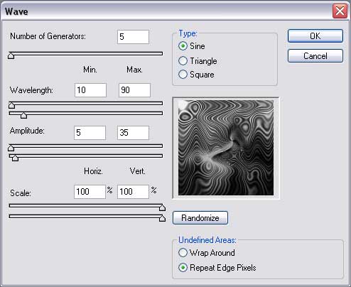 Apply the Wave Filter ( Filter > Distort > Wave ) using the settings shown in the image to the left.